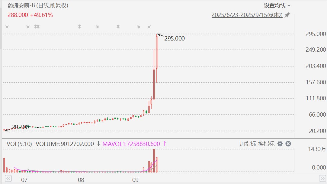 生物制药公司药捷安康-B(2617.HK)今日股价再度飙升,盘中一度涨53%报295港元,再创上市新高,市值升破1100亿港元。自6月23日上市至今,不到3个月时间,药捷安康股价(较IPO价格13.15港元)已飙升超21倍。