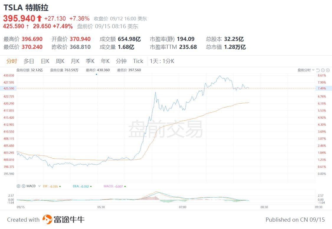 特斯拉盘前一度上涨近9%,报430美元;该股上周五收涨超7%。特斯拉行政总裁马斯克斥资10亿美元,在上周五买入约257万股特斯拉,是2020年2月以来首次增持股份。