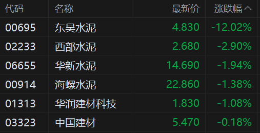 港股水泥股集体下跌,其中,东吴水泥大跌超12%表现最弱,西部水泥跌3%,华新水泥跌2%,海螺水泥、华润建材科技跌超1%,中国建材跟跌。