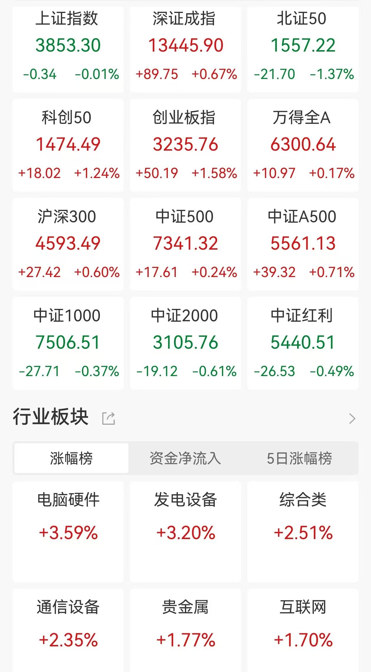 A股主要指数今日涨跌不一,截至收盘,沪指跌0.01%报3853点,深证成指涨0.67%,创业板指涨1.58%创三年多新高。全市场成交额2.39万亿元,较前一交易日增量446亿元,超3800股下跌。