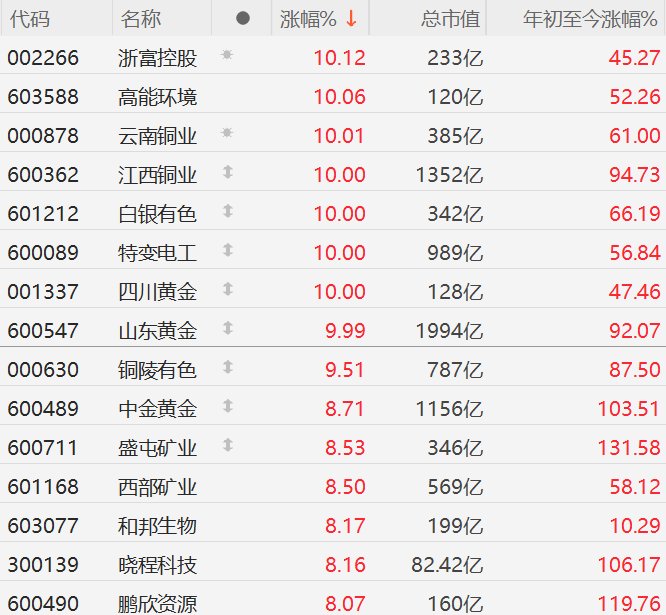 A股市场黄金概念股掀涨停潮,其中,浙富控股、高能环境、云南铜业、江西铜业、白银有色、四川黄金、山东黄金10CM涨停,铜陵有色逼近涨停,中金黄金、盛屯矿业、西部矿业、晓程科技、鹏欣资源涨超8%。消息面上,金价继续破顶,美联储本月降息0.25%的预期升温,加上美国政府持续停摆引发避险需求,刺激黄金现货价格昨日盘中升穿4000美元大关,最高涨至4059.25美元,再创历史新高。年初至今,金价已攀升超54%。多种因素推动黄金升势,包括减息预期、政治和经济的持续不确定性、央行的稳健买盘、黄金交易所交易基金流入以及美元疲软。