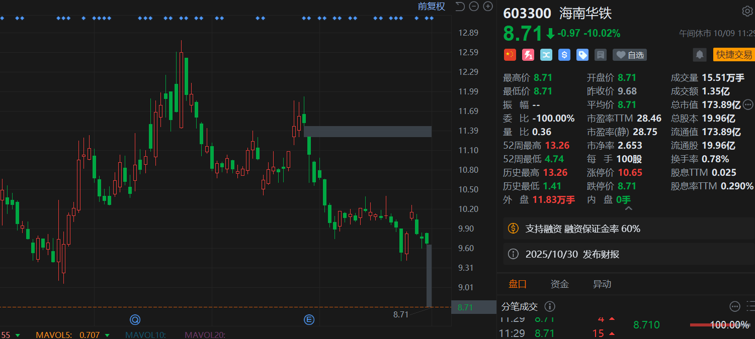 海南华铁(603300.SH)今日一字板跌停,目前封单金额高达25.5亿元,报8.71元创今年4月中旬以来新低,总市值174亿元。