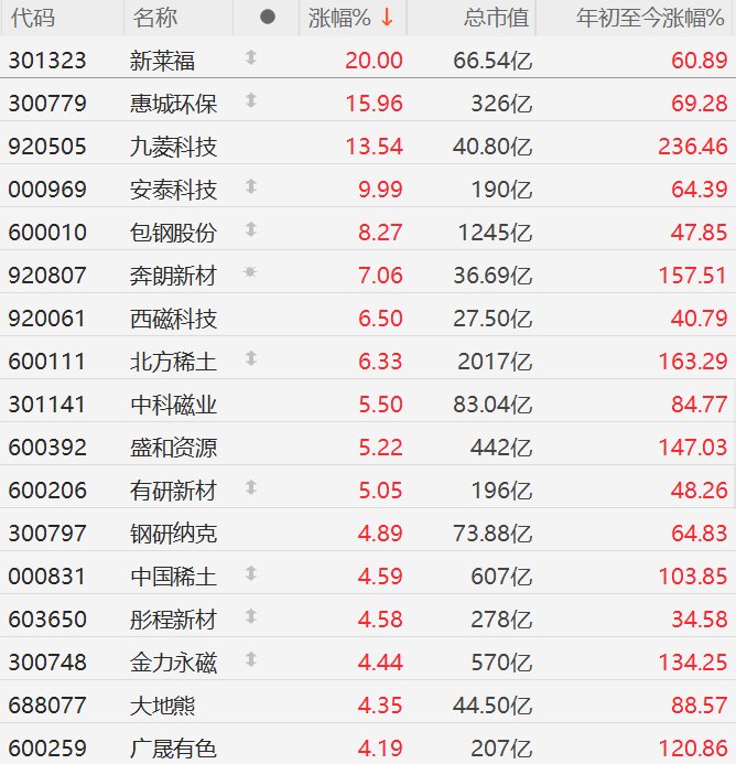 两大稀土巨头再次提价,A股市场稀土股逆势上涨。其中,新莱福20CM涨停,惠城环保涨超15%,九菱科技涨超13%,安泰科技10CM涨停,包钢股份涨超8%,奔朗新材涨超7%,西磁科技、北方稀土涨超6%,中科磁业、盛和资源、有研新材涨超5%,钢研纳克、中国稀土、彤程新材、金力永磁、大地熊、广晟有色涨超4%。