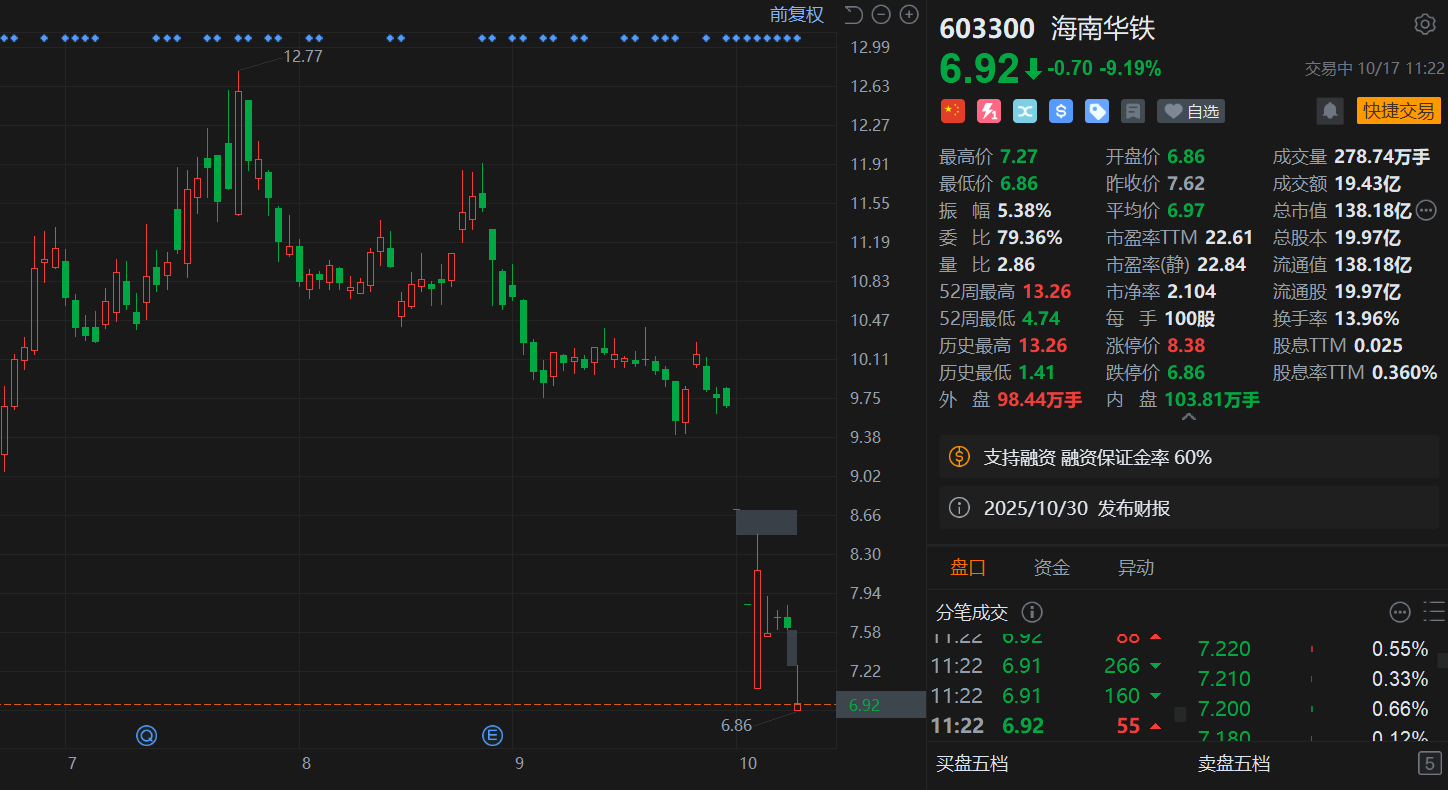 海南华铁(603300.SH)今日开盘跌停,盘中冲高跌幅一度收窄至5%,目前再度跌超9%,报6.9元,总市值137.8亿元。