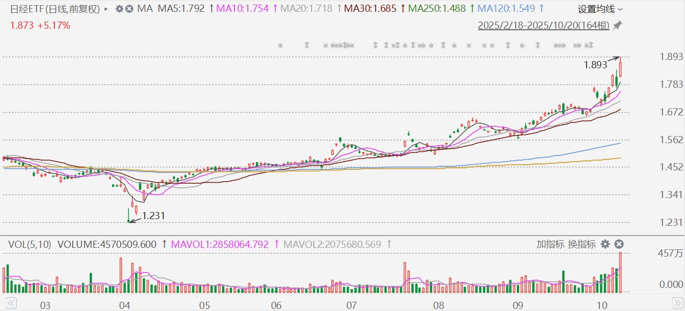 随着日本股市大涨,A股市场日经EFT(513520)盘中大涨超6%,报1.893元,创历史新高。消息面上,高市早苗出任首相之路几成定局,日经225指数今日盘中一度涨近3%报48970点,再创历史新高。