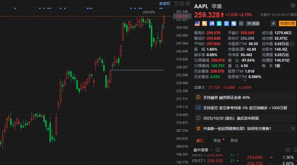 苹果股价创历史新高,报259.7美元,涨幅3%,总市值达3.85万亿美元。研究公司Counterpoint报告显示,iPhone 17系列在中国和美国市场的早期销售强劲,销量比iPhone 16系列高出14%,其中iPhone 17基本款在中国销量几乎翻了一番。