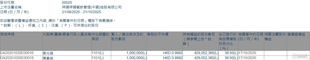 格隆汇10月21日丨根据联交所最新权益披露资料显示,2025年10月17日,呷哺呷哺(00520.HK)获执行董事兼主席贺光启在场内以每股均价0.9982港元增持100万股,涉资约99.82万港元。