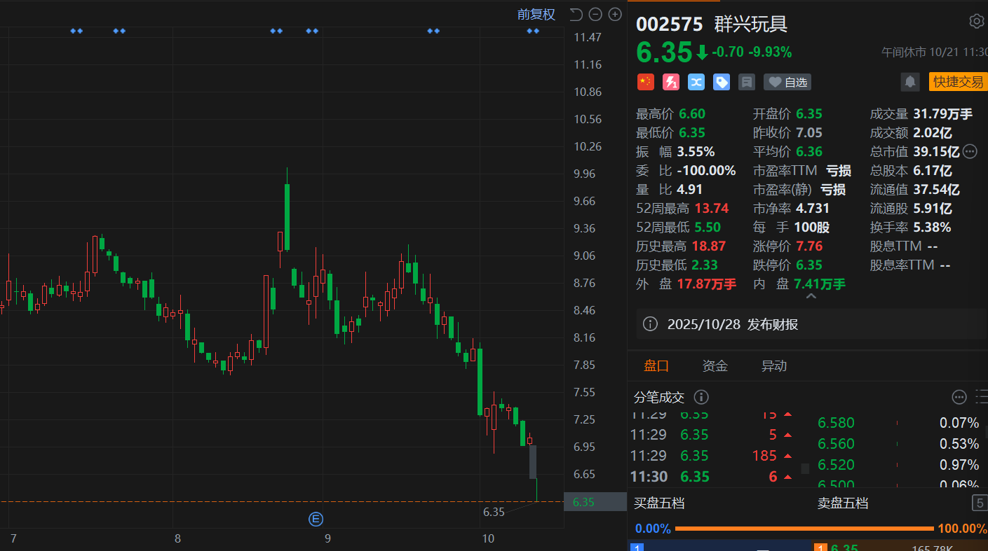 群兴玩具(002575.SZ)跌停,目前封单金额超1亿元,报6.35元刷新阶段新低,总市值不足40亿元。