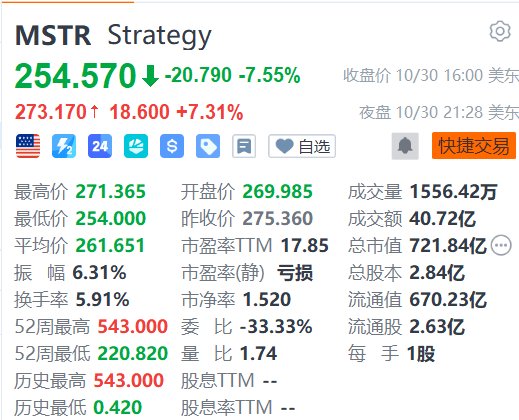 Strategy(MSTR.US)在目前的夜盘交易中涨超7%,报272.87点。消息面上,公司盘后公布业绩显示,2025年第三季度营收1.287亿美元,高于市场预期的1.168亿美元。净利润26.5亿美元,同比扭亏为盈,且为连续第二个季度实现盈利;第三季度现金及现金等价物为5430万美元;截至10月26日,持有640,808枚比特币,总成本达474.4亿美元,平均每枚比特币成本为74,032美元。公司预计2025财年净利润约为240亿美元。公司业绩指引假设2025年底比特币价格为15万美元。