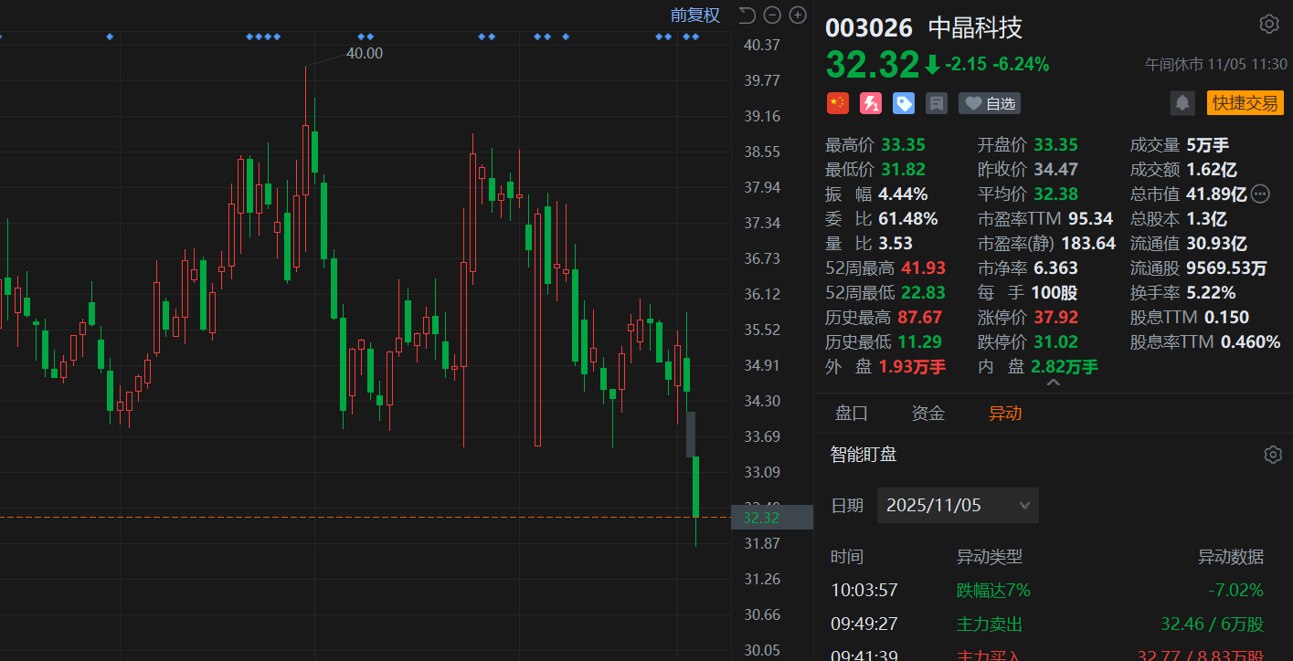 中晶科技(003026.SZ)午间收跌6.24%,报32.32元创今年6月底以来新低,总市值41.9亿元。消息上,中晶科技发布股份减持公告,股东郭兵健,隆基绿能科技股份有限公司拟减持公司股份不超过473.11万股,减持比例不超过公司总股本的3.66%。此外据悉,该公司近三年累计发布减持计划公告3次。公司是一家专业从事半导体单晶硅材料及其制品研发、生产和销售的国家高新技术企业,产品涵盖半导体晶棒、研磨片、化腐片、抛光片、半导体功率芯片及器件等。