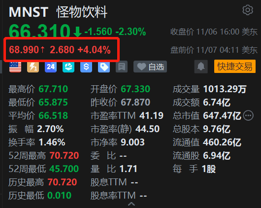 能量饮料制造商怪物饮料(MNST.US)美股盘前涨4%。消息上,怪物饮料发布的第三季度调整后每股收益为0.56美元,而去年为0.41美元(同比增长36%),远高于市场预期的0.48美元。MNST的净销售额增长了17%,达到22亿美元(比市场预期高出9000万美元),毛利率扩大了250个基点至55.7%(比市场预期高出160个基点)。