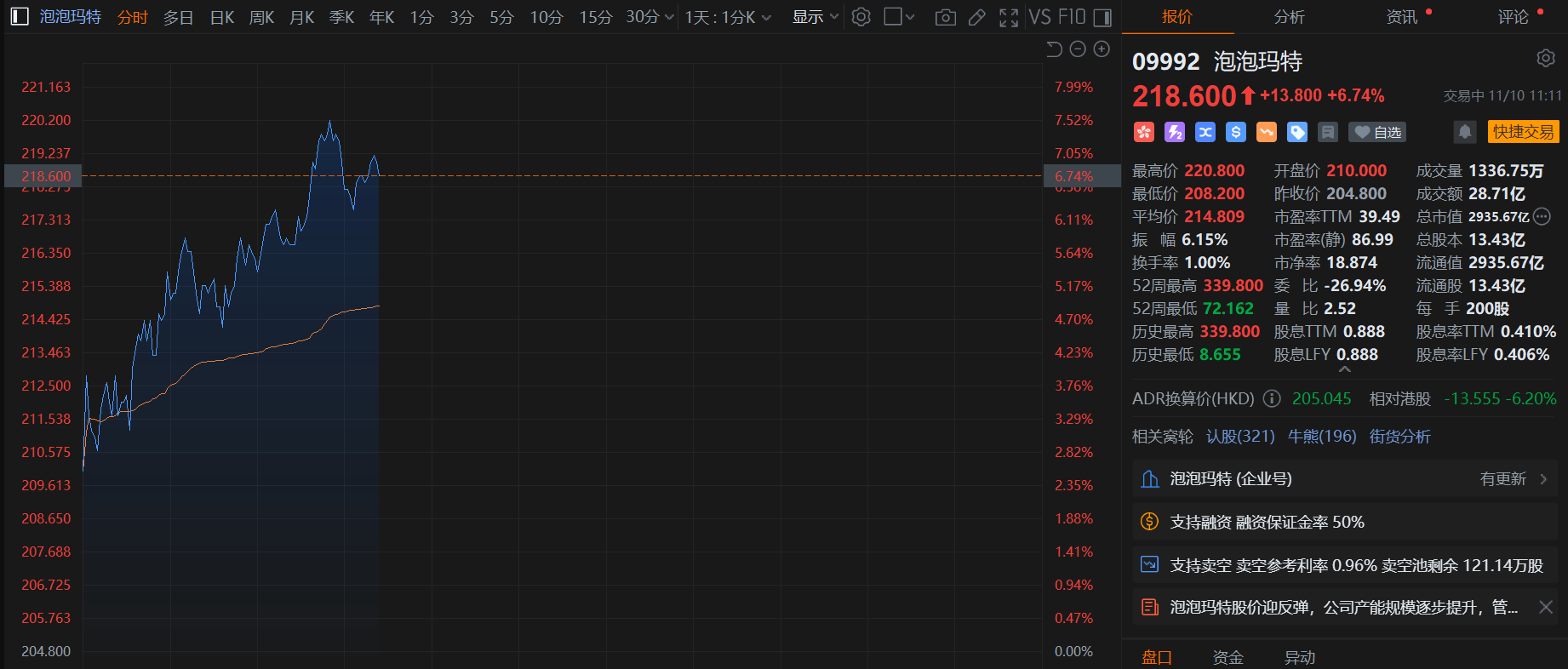 泡泡玛特(9992.HK)高开高走,盘中一度涨近8%,现报218.6港元,总市值2933亿港元。