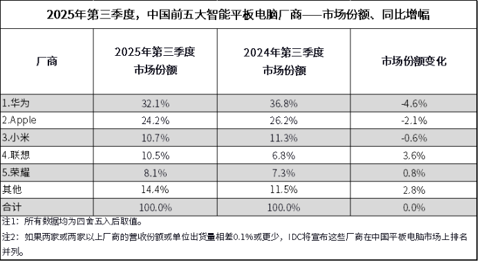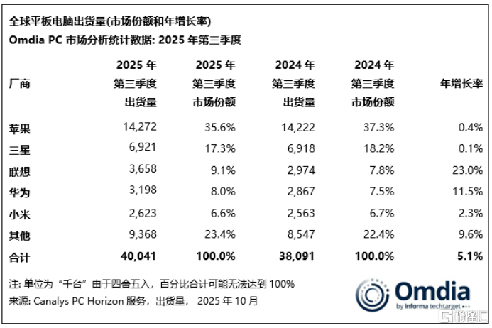 2025年11月10日,国际数据公司(IDC)发布的 2025 年第三季度中国平板电脑市场报告显示,中国平板电脑市场出货量为849万台,同比增长10.9%。其中,联想平板凭借消费与商用市场的双线强势表现,市场份额从 2024 年同期的 6.8% 跃升至 10.5%,排名一举挺进行业第四位,成为本季度中国平板市场最亮眼的增长力量。排名市场前三的华为、苹果、小米市占率均教去年同期出现下滑。