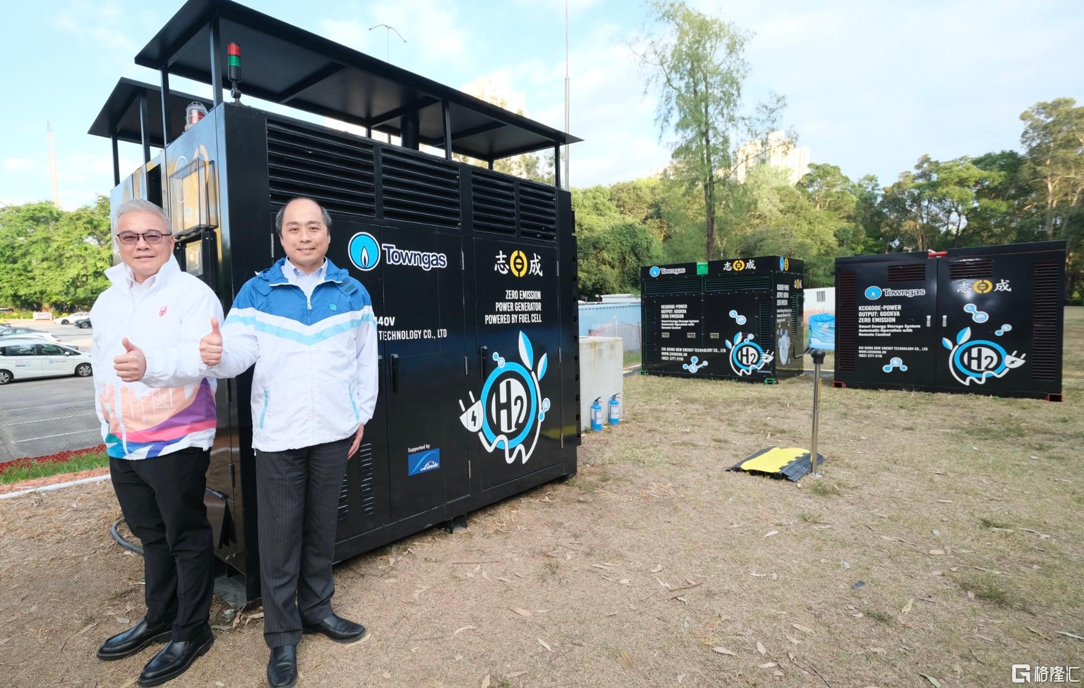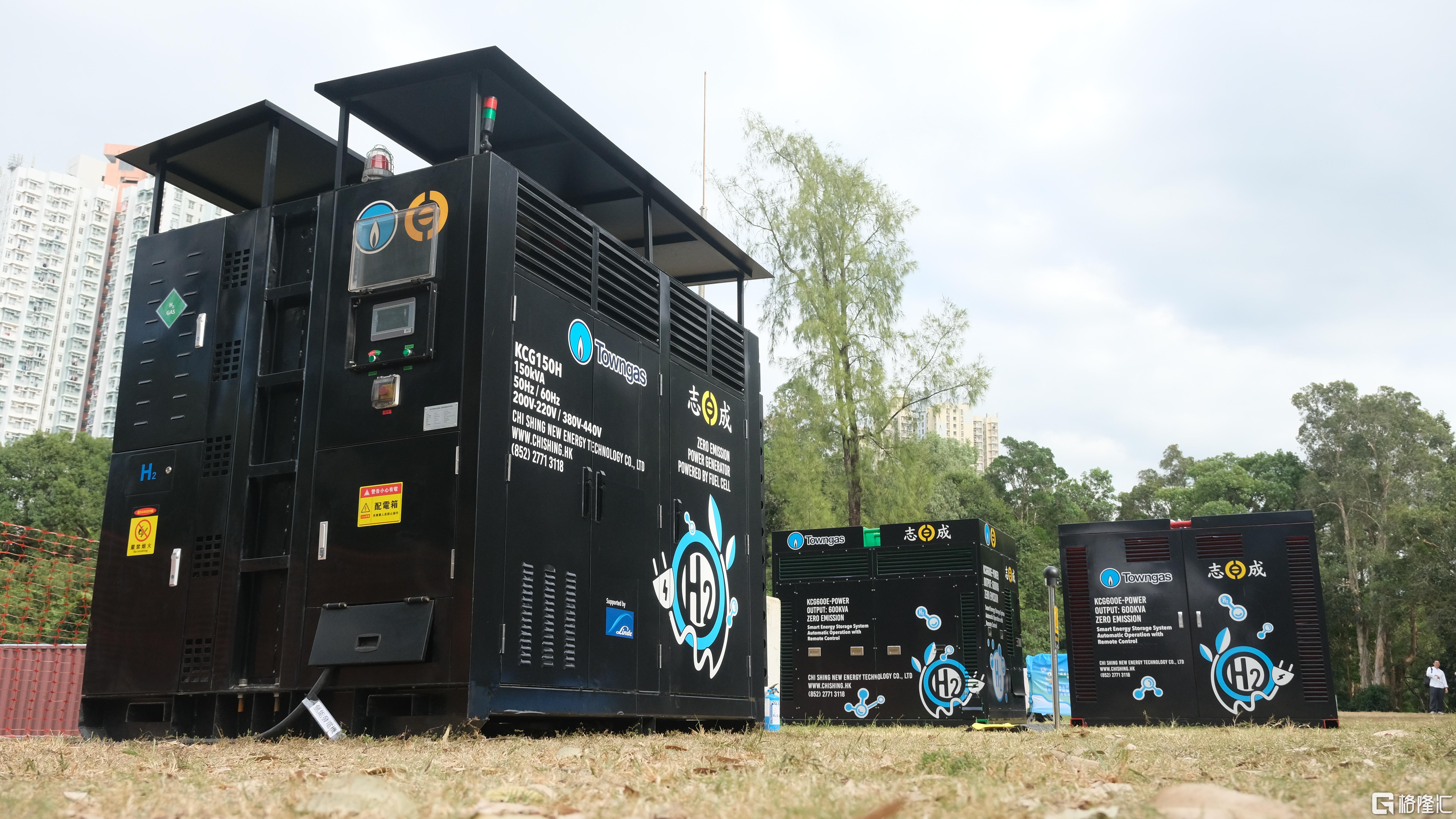 煤气公司与志成新能源科技有限公司共同开发的一体化氢能发电机,日前已设置于粉岭高尔夫球场的全运会高球赛事现场。这套大约一个货柜大小的机组,内置发电系统、氢气储存瓶,应用由煤气公司生产的氢气产生电力,配合电池储能系统,为场内的警察指挥总部、志愿者总部、机电署及煤气公司办公室供应临时电力。