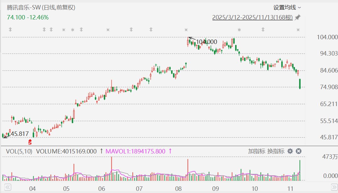 腾讯音乐(1698.HK)绩后重挫,一度大跌近13%报73.95港元,股价创7月以来新高,截至目前成交额放大至逾3亿港元。