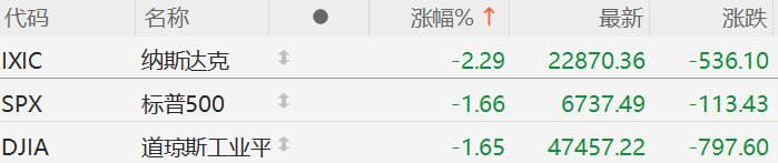 周四,美股三大股指在当日的交易中集体下挫,以科技股为主的纳斯达克综合指数收盘暴跌2.29%。科技巨头普遍走低,特斯拉收跌6.64%,英伟达下跌3.58%。美股三大指数收市都录得逾一个月以来最差单日表现。风险情绪恶化也蔓延至加密货币市场,比特币跌破10万美元大关,以太坊一度跌超10%。