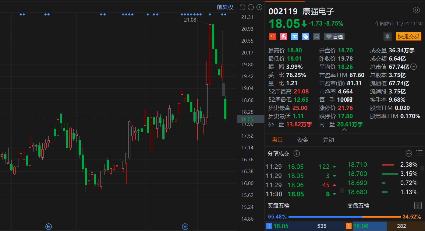 康强电子(002119.SZ)午间大幅收跌8.75%,近日连跌完全抹平此前涨幅,报18.05元,总市值67.7亿元。消息上,康强电子发布股份减持公告,股东宁波司麦司电子科技有限公司拟减持公司股份不超过375.26万股,减持比例不超过公司总股本的1%。另外,日前公司公告持股5%股东所持股份被司法冻结。公司是一家专业从事各类半导体封装材料引线框架、键合丝等半导体封装材料的开发、生产、销售的高新技术企业。