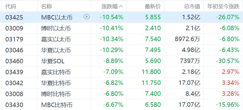 港股市场加密货币现货ETF全线重挫,其中,MBC以太币、博时以太币、嘉实以太币、华夏以太币大跌超10%,华夏SOL跌超8%,嘉实比特币跌7%,华夏比特币、博时比特币、MBC比特币跌超6%。