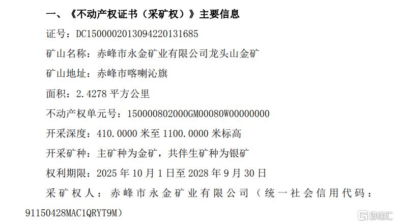 格隆汇11月16日丨恒星科技(002132.SZ)发布公告,公司全资子公司赤峰市永金矿业有限公司于2025年11月14日收到赤峰市自然资源局颁发的《不动产权证书(采矿权)》。