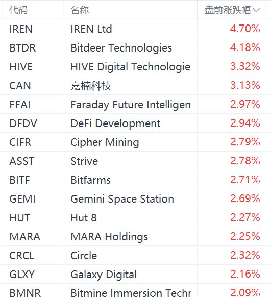 美股加密货币概念股盘前走高,其中,IREN Ltd、Bitdeer Technologies涨超4%,嘉楠科技涨超3%,Strive、Bitfarms、Circle涨超2%。
