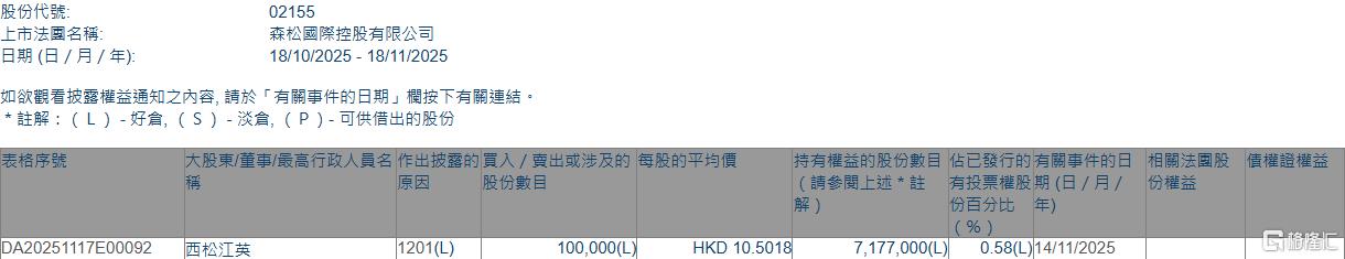 格隆汇11月18日丨根据联交所最新权益披露资料显示,2025年11月14日,森松国际(02155.HK)遭行政总裁兼执行董事西松江英在场内以每股均价10.5018港元减持10万股,涉资约105.018万港元。