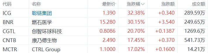 中概股收盘涨幅居前的个股为:聪链集团涨32.38%,燃石医学涨30.15%,创智环球科技涨20.7%,康乃德生物涨17.45%,CTRL Group涨17.02%。(格隆汇)