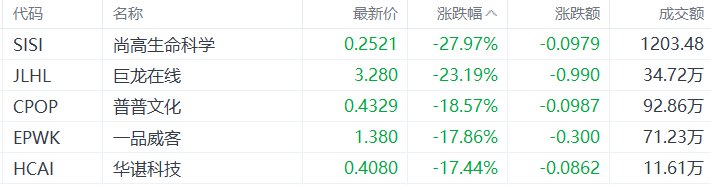 美股异动丨尚高生命科学跌27.97%,为跌幅最大的中概股