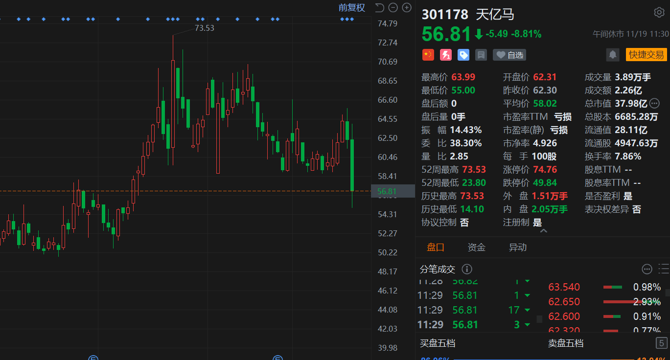 天亿马(301178.SZ)午间大幅收跌8.8%,报56.81元创逾2个月新低价,总市值38亿元。消息上,天亿马抛出重大资产重组计划,拟通过发行股份及支付现金的方式购买广东星云开物科技股份有限公司98.5632%的股权,交易金额11.89亿元。其中,天亿马拟向其实际控制人之一马学沛发行股份募集配套资金不超过1.55亿元。值得注意的是,截至评估基准日,标的公司100%股权评估值为12.1亿元,经交易各方协商,标的公司98.5632%股权的整体交易作价为11.89亿元。标的资产评估增值率高达649.77%。业绩方面,天亿马的净利润已连续三年呈现下滑趋势。