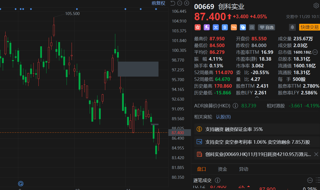 昨日下跌创阶段新低的创科实业(0669.HK)反弹逾4%,报87港元,市值重回1600亿港元。消息上,创科实业2025年11月19日耗资4210.95万港元回购50万股,回购价格每股84-84.95港元。