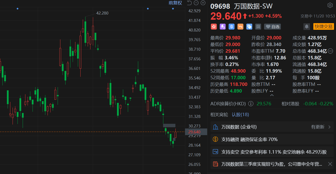 万国数据-SW(9698.HK)盘中一度涨近6%,该股近期走弱此前更是录得6连跌行情,现报29.64港元,总市值470.5亿港元。消息上,万国数据2025年第三季度的净收入同比增长10.2%,达到28.87亿元(人民币,下同);净利润7.29亿元,同比扭亏为盈;经调整EBITDA为13.42亿元,同比增长11.4%。公司维持2025年总收入指引112.9亿至115.9亿元;经调整EBITDA介乎51.9亿至53.9亿元。资本支出指引为27亿元。