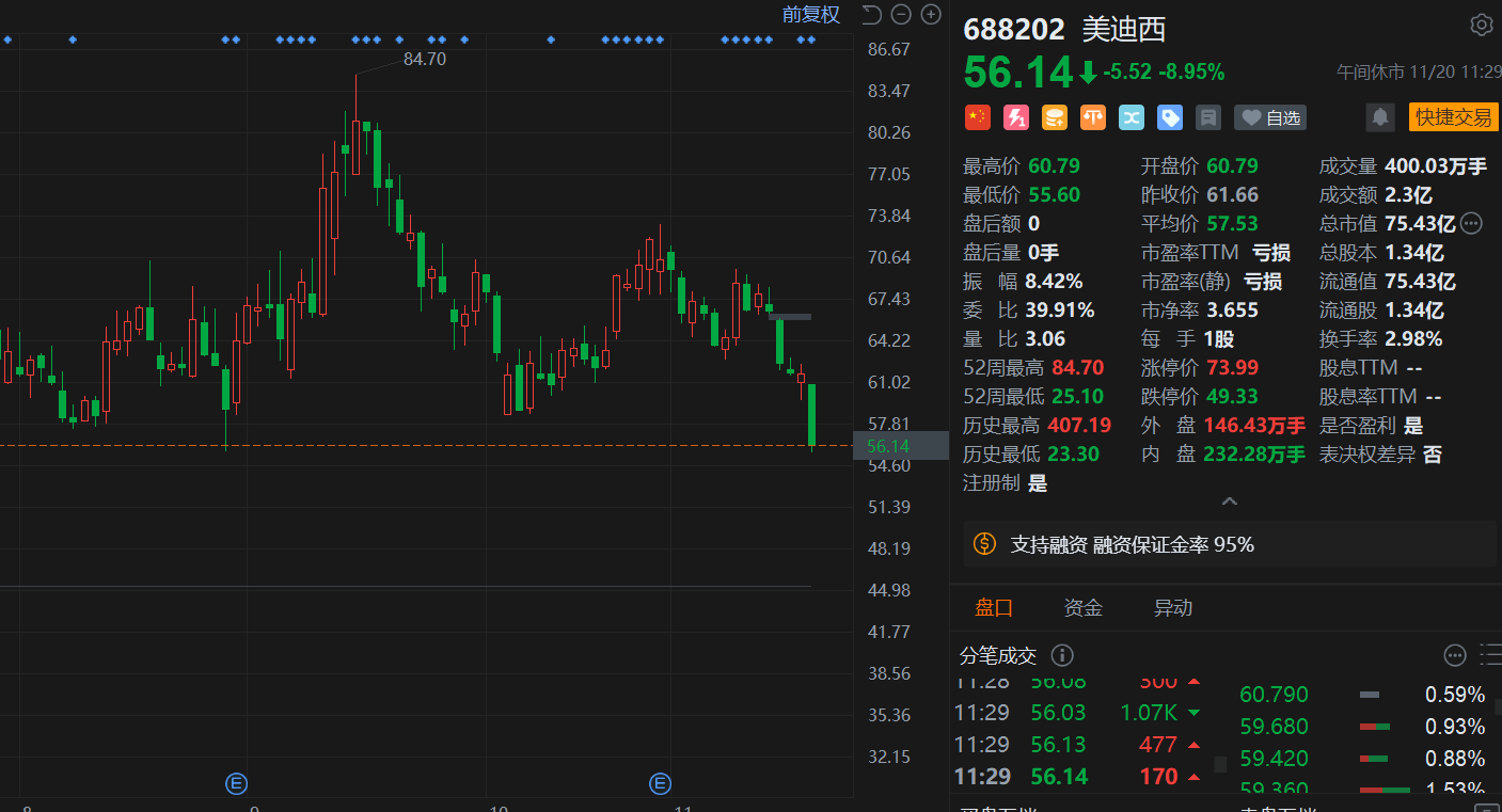 美迪西(688202.SH)午间大幅收跌近9%,报56.14元创阶段新低,总市值75.4亿元。消息上,美迪西发布股份减持公告,股东陈国兴拟减持公司股份不超过220万股,减持比例不超过公司总股本的1.64%。此外据悉,该公司近三年累计发布减持计划公告4次。需要注意的是,公告中披露拟减持股份数量不代表最终实际减持股份数。此前公布的第三季度营收为3.03亿元,同比增长7.94%;净利润亏损1678.65万元。