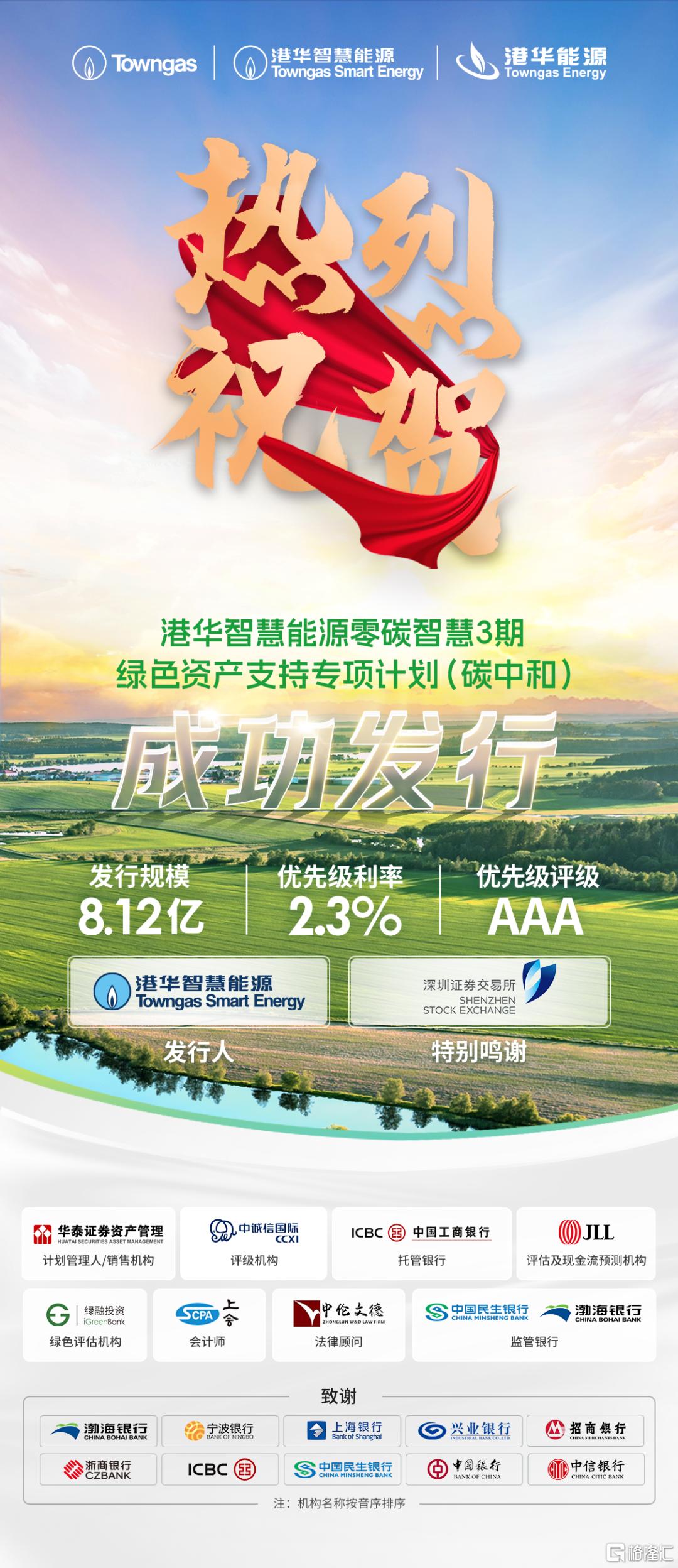 港华智慧能源于2025年11月11日在深圳证券交易所成功发行"零碳智慧3期绿色资产支持专项计划(碳中和)"。此次发行规模为8.12亿元人民币,优先级票面利率为2.3%,是2025年内的第二次发行,也是50亿元储架额度内的第三期发行。本期产品获得商业银行、龙头券商、信托、国有投资机构和外资机构等多元化金融机构的积极认购,彰显了市场对公司卓越的资产运营能力、前瞻性的综合能源战略的信心。