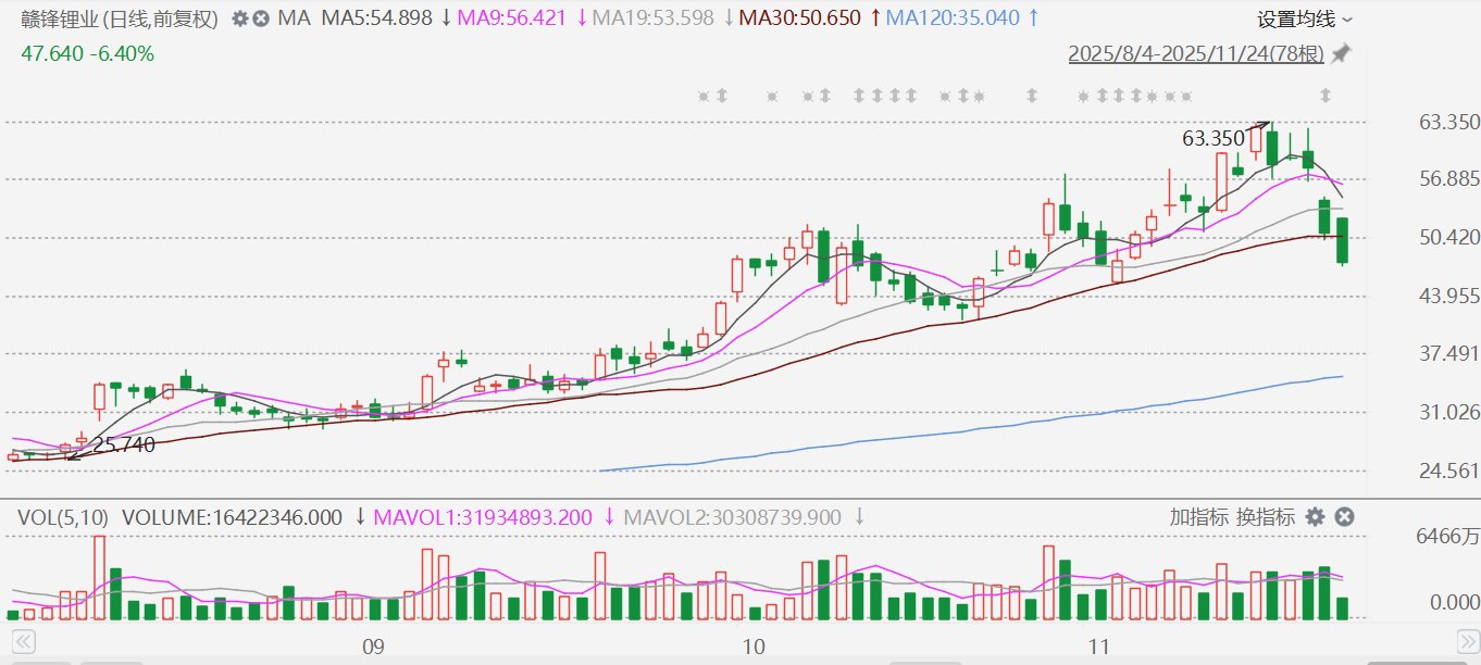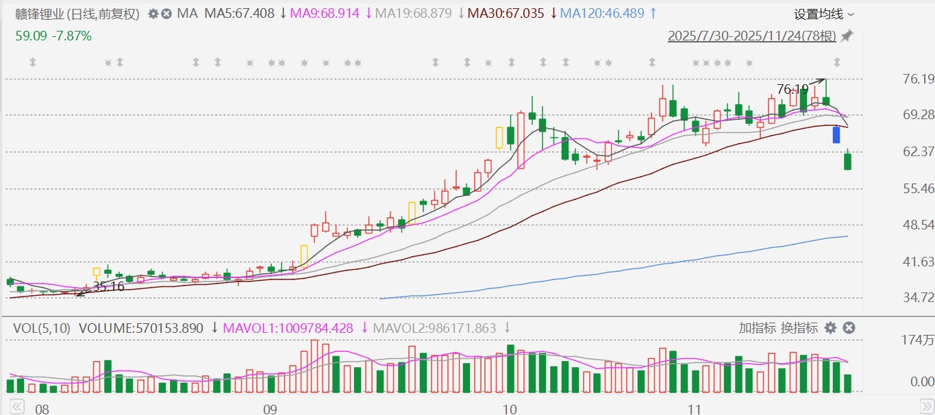 赣锋锂业AH股齐跌,A股大跌超8%报59元,H股大跌超7%报47.26港元,AH股均为连续第三日回调。消息面上,高盛将赣锋锂业H股评级从中性下调至卖出,目标价32港元,理由是锂现货价格面临下行风险,因下游市场短期反馈欠佳以及补库存增速放缓。高盛在最新的研究报告中指出,尽管锂市场基本面已显著改善,供需平衡预计将在明年上半年保持紧张,但储能系统库存周期延长可能成为抵消因素。该行将2025年下半年中国碳酸锂基准现货价格预测下调至每吨9500美元,较此前预期低14%。该行将赣锋锂业2026-2027年盈利预估下调36%-42%,并预计2025年将由盈转亏。