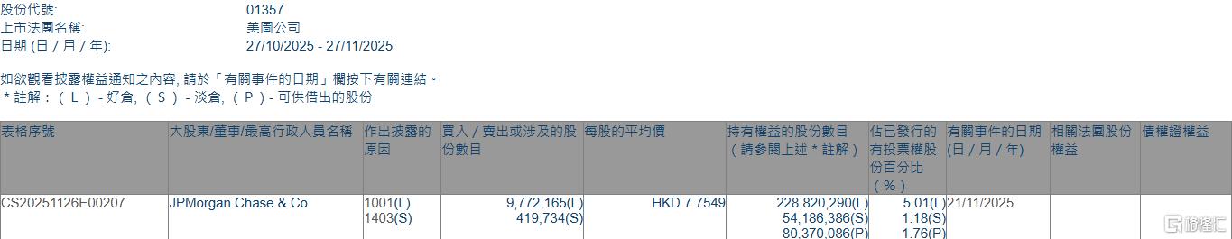 格隆汇11月27日丨根据联交所最新权益披露资料显示,2025年11月21日,美图公司(01357.HK)获JPMorgan Chase & Co.以每股均价7.7549港元增持好仓977.22万股,涉资约7578.22万港元。