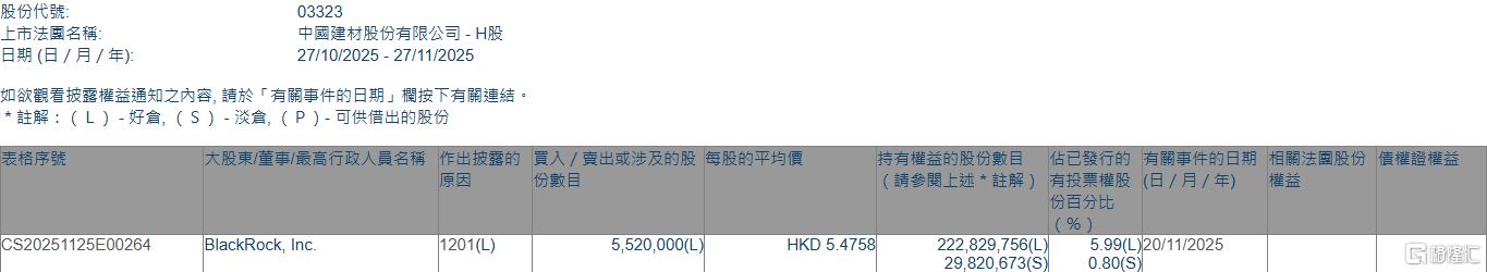 格隆汇11月27日丨根据联交所最新权益披露资料显示,2025年11月20日,中国建材(03323.HK)遭BlackRock, Inc.在场内以每股均价5.4758港元减持好仓552万股,涉资约3022.64万港元。