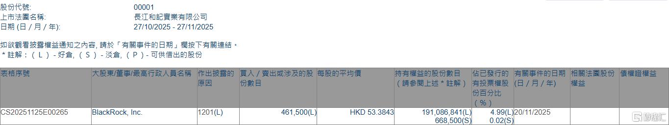 格隆汇11月27日丨根据联交所最新权益披露资料显示,2025年11月20日,长和(00001.HK)遭BlackRock, Inc.在场内以每股均价53.3843港元减持好仓46.15万股,涉资约2463.7万港元。