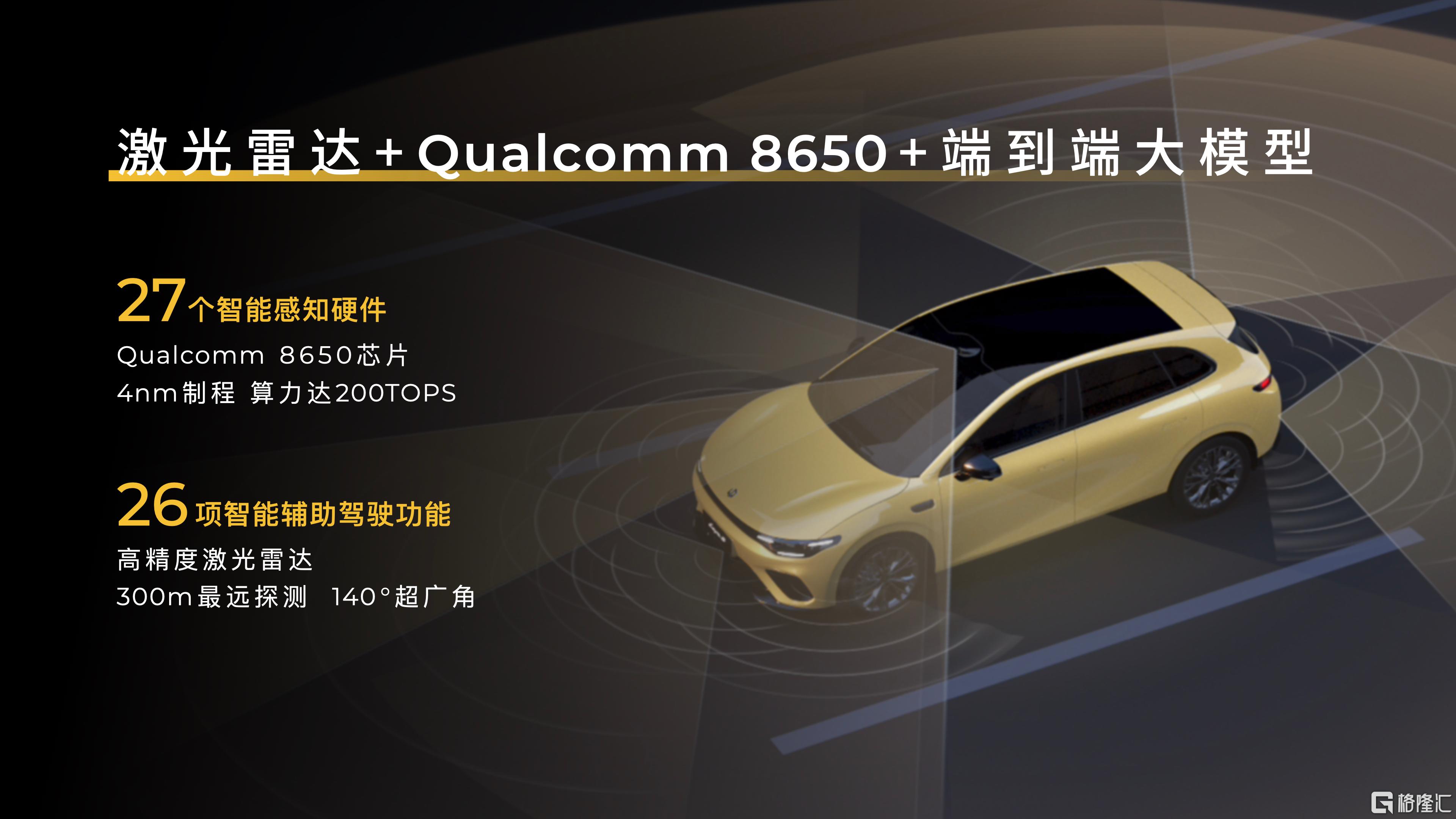 辅助驾驶方面,零跑Lafa5搭载含激光雷达在内的27个高精度感知硬件与高通8650芯片,支持端到端辅助驾驶,可实现高速领航辅助(NAP)、通勤领航辅助(CNAP),可以不依赖高精地图,实现领航辅助驾驶,未来将通过OTA实现城区领航辅助。