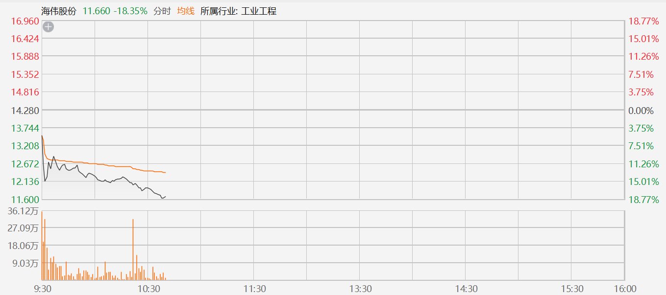 中国电容器薄膜制造商海伟股份(9609.HK)今日首日在港挂牌上市,盘中大跌近19%至11.6港元,上市即破发,市值跌破18亿港元。