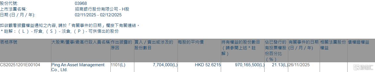 格隆汇12月2日丨根据联交所最新权益披露资料显示,2025年11月26日,招商银行(03968.HK)获Ping An Asset Management Co., Ltd.在场内以每股均价52.6215港元增持770.4万股,涉资约4.05亿港元。