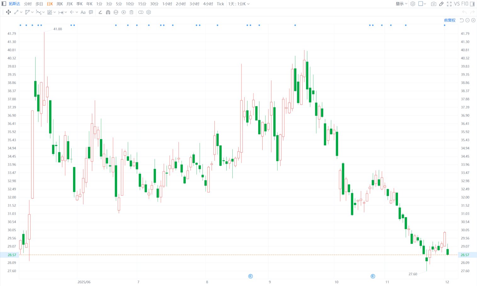 拓斯达(300607.SZ)现跌4.45%报28.57元,暂成交3亿元,最新市值136亿元。拓斯达公告称,股东杨双保计划在本公告披露之日起3个交易日后的3个月内,通过大宗交易、集中竞价交易方式减持公司股份不超过564.05万股,占公司剔除回购专用账户股份后的总股本比例1.1938%。(格隆汇)