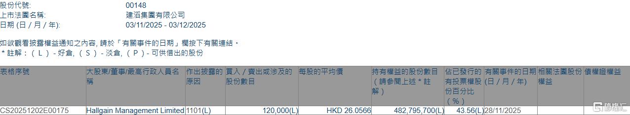 格隆汇12月3日丨根据联交所最新权益披露资料显示,2025年11月28日,建滔集团(00148.HK)获Hallgain Management Limited在场内以每股均价26.0566港元增持12万股,涉资约312.68万港元。