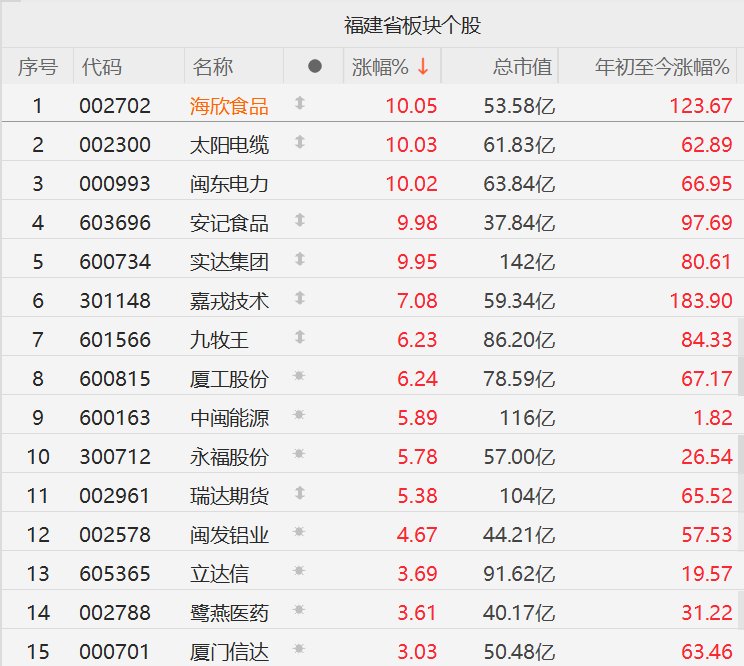 延续昨日涨势,福建股今日再度集体活跃,其中,海欣食品6连板、太阳电缆、安记食品2连板、闽东电力涨停,实达集团逼近涨停,嘉戎技术涨7%,九牧王、厦工股份涨超6%,中闽能源、永福股份、瑞达期货涨超5%。