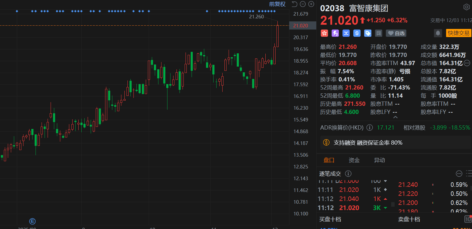 富智康集团(2038.HK)逆势拉升涨超6%,最高报21.26港元创2019年4月以来新高,总市值164亿港元。消息上,富智康集团12月2日以每股19.040港元至19.300港元的价格回购40.00万股,回购金额达770.62万港元。自11月25日以来公司已连续6日进行回购,合计回购95.30万股,累计回购金额1813.20万港元。 据统计,今年以来该股累计进行60次回购,合计回购1671.46万股,累计回购金额9838.91万港元。