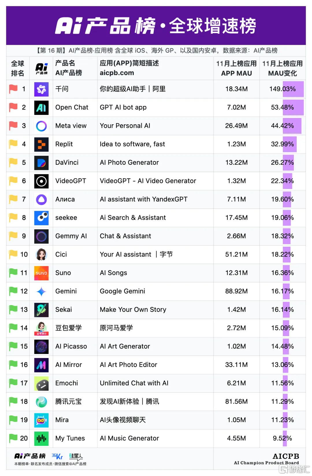 AI行业榜单“AI产品榜”发布最新月度数据。阿里巴巴最新推出的千问App凭借爆发式增长,位列全球AI应用增速榜第一名,月活增速高达149.03%。该应用于11月17日开启公测,上线仅一周,下载量便突破1000万大关。