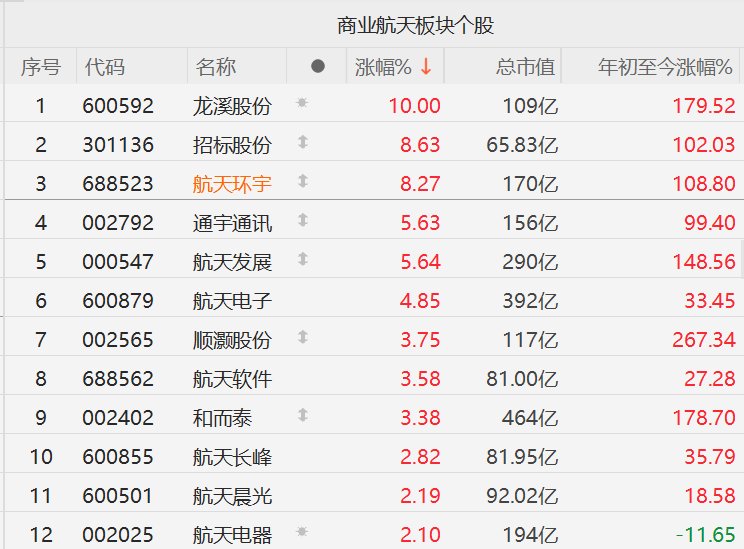 A股市场商业航天股今日集体活跃,其中,龙溪股份涨停,招标股份、航天环宇涨超8%,通宇通讯、航天发展涨超5%,航天电子涨超4%,顺灏股份、航天软件、和而泰涨超3%。消息面上,12月3日中午,朱雀三号遥一运载火箭在东风商业航天创新试验区发射升空,按程序完成了飞行任务,火箭二级进入预定轨道,火箭一子级回收失败。据了解,本次朱雀三号遥一运载火箭的首飞入轨,也是国内首次实现九机并联液氧甲烷动力系统的集成应用。