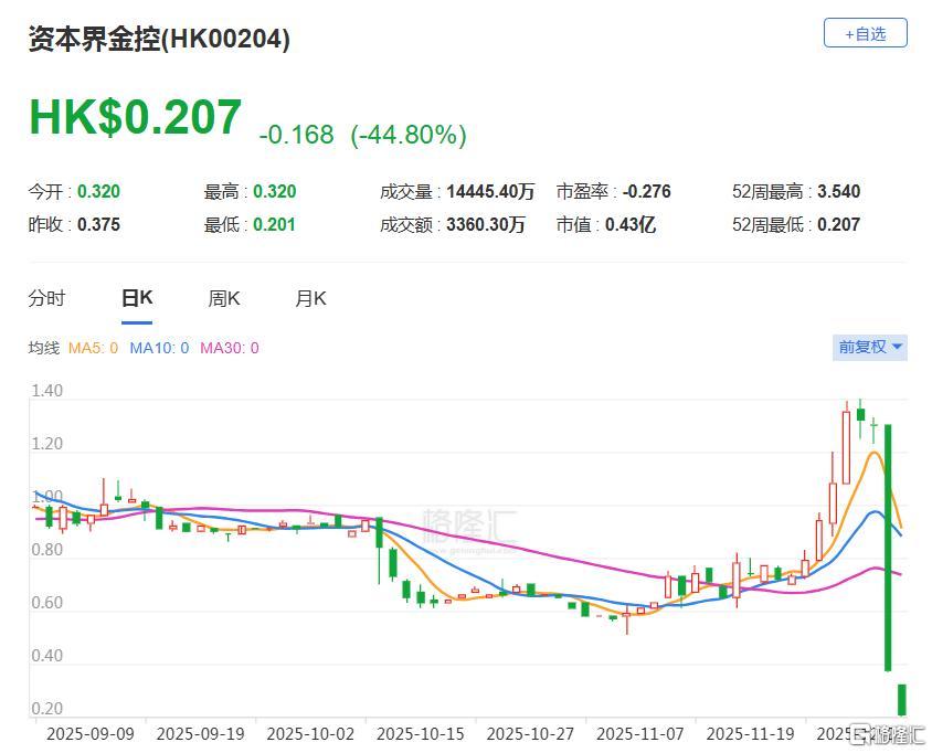 资本界金控在昨日收跌超70%后,今日仍未止跌,收盘再度暴跌超40%至0.207港元,再创历史新低。公司近日公布,截至9月30日止中期亏损5013.4万港元,比去年同期亏损1059.7万港元扩大;每股亏损0.57港仙,不派中期息。集团指,期内没有收益,而其他收入520.2万港元,跌31.8%,按公平值计入在损益处理的财务资产的公平值变动亏损30.9万港元。
