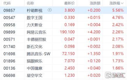 影视娱乐股震荡走高,柠檬影视涨超5%,力天影业、新石文化、猫眼娱乐等跟涨。