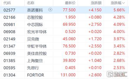 半导体股涨幅居前,英诺赛科涨超5%,芯智控股、中芯国际、宏光半导体涨超4%,贝克微、华虹半导体等跟涨。