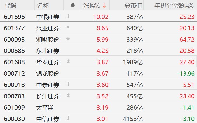 A股券商股涨幅进一步扩大,其中,中银证券涨停,兴业证券涨超8%,湘财股份涨超5%,东北证券涨超4%,华泰证券、锦龙股份、中泰证券、长江证券、太平洋、中信证券涨超3%。中金公司12月3日公告,鉴于本次重组相关事项存在重大不确定性,股票将继续停牌。同日,信达证券也公告,筹划重大资产重组,A股股票将继续停牌。