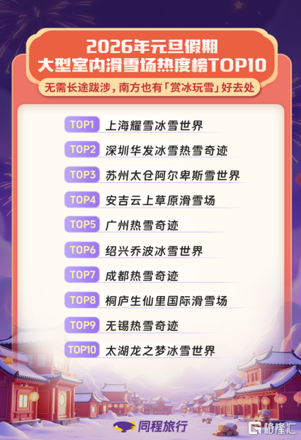 此外,大型室内滑雪场成了部分用户假期游玩的优先选项。同程旅行数据显示,截至12月5日,上海耀雪冰雪世界、深圳华发冰雪热雪奇迹、苏州太仓阿尔卑斯雪世界的元旦假期预订热度持续攀升,占据热门室内滑雪场榜单前3名。